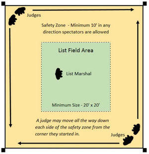 - List fields shall be marked clearly on the ground (i.e. with paint, chalk or tape as examples). The marshals stop the fight as the fighters approach the defined boundary.