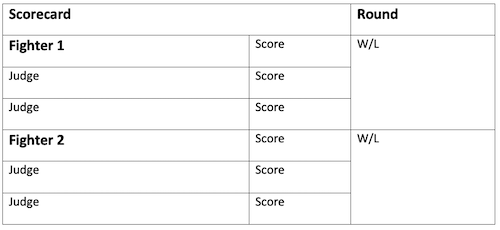 - At the conclusion of the bout, judges shall return to their corner where a MoL will go to each judge and record the score.
